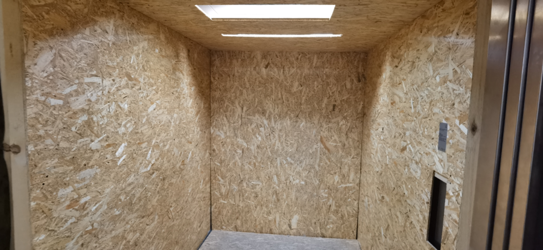 Это грузовой лифт детской больницы, но ещё не до конца обустроенной. Может быть обшивали из тех же соображений.