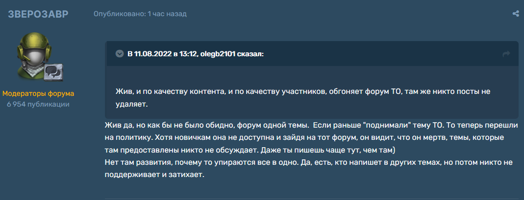 Что же до форума ТО, с которого когда-то все начинали- в этой клоаке уничтожили всю атмосферу, которая когда-то там была. Годы общения могут быть безвозвратно утеряны решением какого-то помешанного, как с темой 'Обсуждаем токсичных', и уничтожением первого форума.