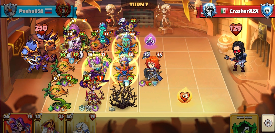 Интересный, и крайне веселый замес. Тотем перед шаманом возращает урон сразу варлорду противника. Ход был за мной, и я бы вылетел, у противника два таких тотема, а мои как раз долбят по ним, но - одного удара мне не хватило, а второй я не нанес, потому что, хаха, Юстия противника дала "промах" моей Мелии. Противник перехитрил сам себя. Ну и чего, мелия отравляет двух юнитов противника и в конце от этого наносится урон варлорду. Чувак вылетает, партия за мной.