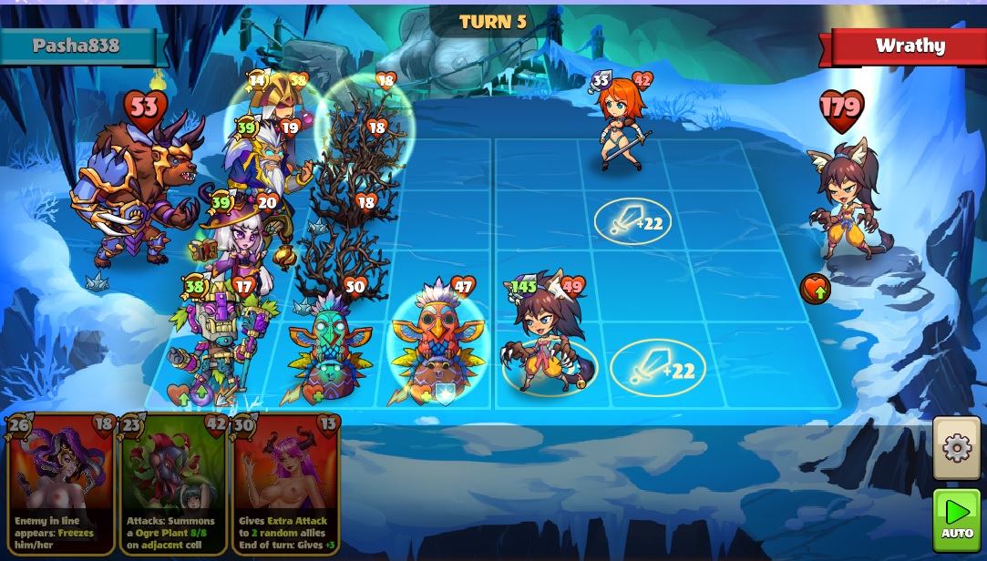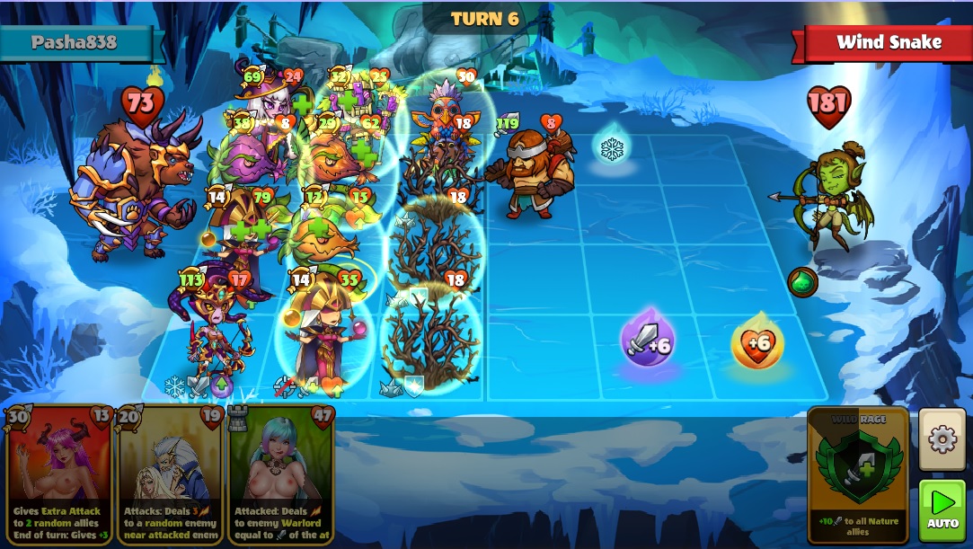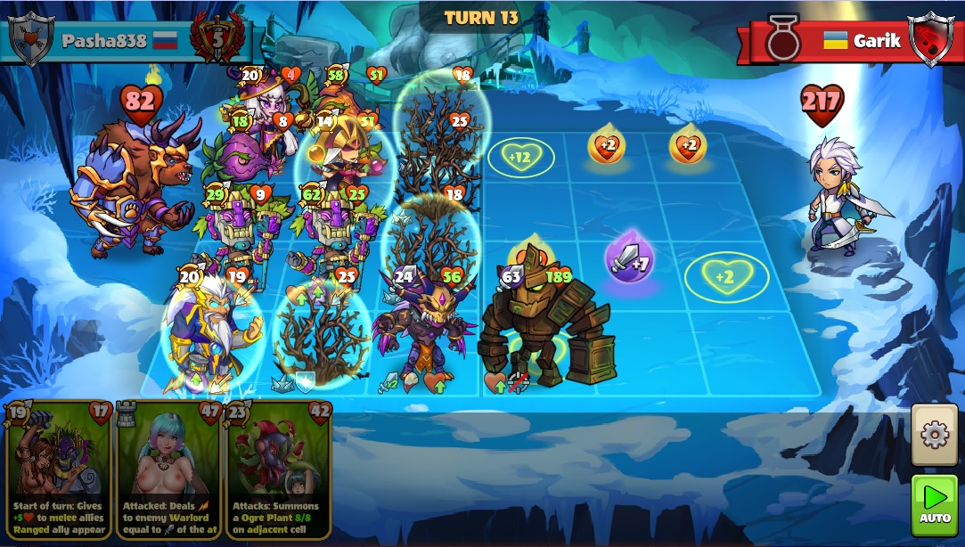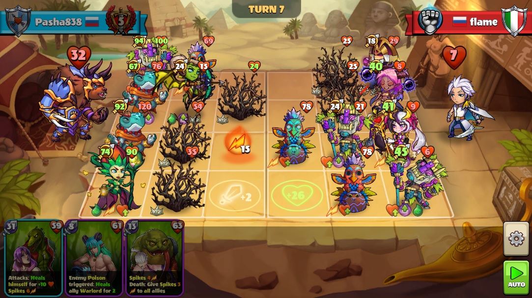 Тут всё решала бы постановка Афродиты, в конце хода наносящей урон от ХП рандомного юнита, я бы вылетел сходу, но противник пронубил/протупил и выставил вместо неё почему-то снежную деву. И всё на этом для него, конечно, закончилось. Вероятно, всё уперлось в то, что Афродиту он ставил аккурат до этого, но у меня стояла летающая черепаха, все били по шипам, варлорд за счет этого хилился, и удара Афродиты не хватило. А потом я её вынес от греха подальше ) Ну и всё, Скала бесполезен, партия за мной.