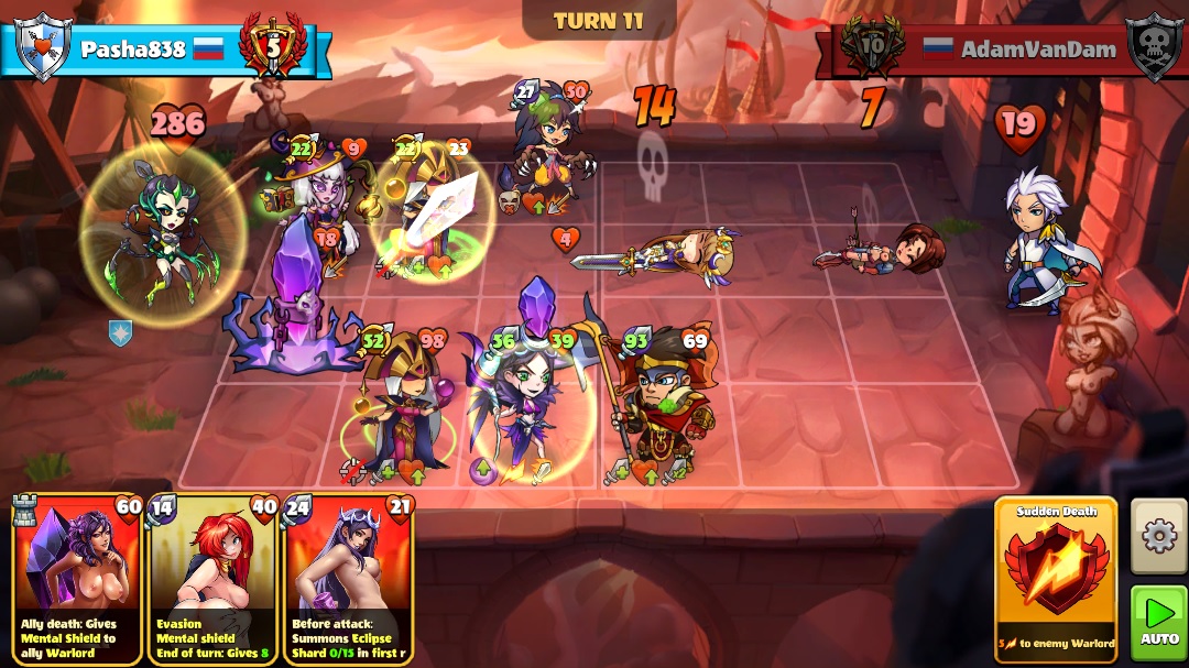 Ну и всё. Хоро-хоро 22/6 сносит камен Муны, следующий хоро-хоро сносит Муне ментальный щит, далее её лупит Юстия и добивает Ханако. Харта чиста, ни одного юнита противника и, вдобавок, мой варлорд под ментальным щитом. Юстия при выходе нового противника сразу присваивает ему "Промах" на 1 ход.