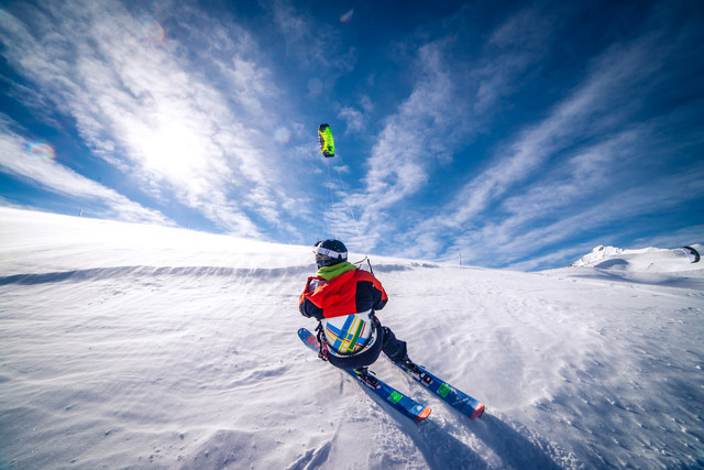 Можно на чем угодно. На лыжах, на сноуборде, на коньках. Зимний вариант называется сноукайтинг и видимо он прикольнее летнего, потому что позволяет неслабо прыгать на рельефе, что зимой намного безопаснее.